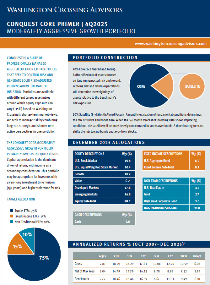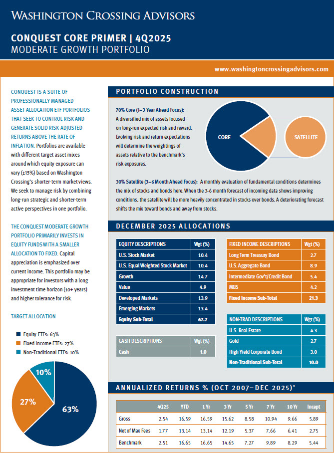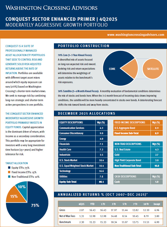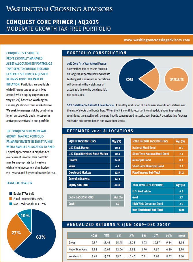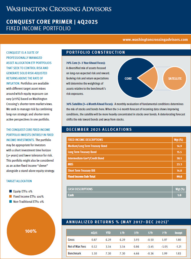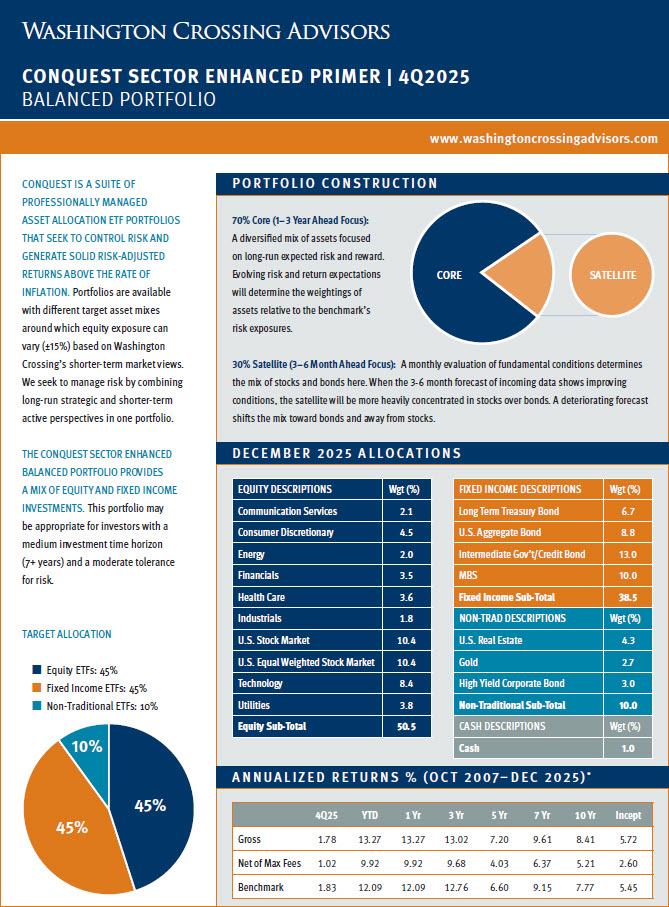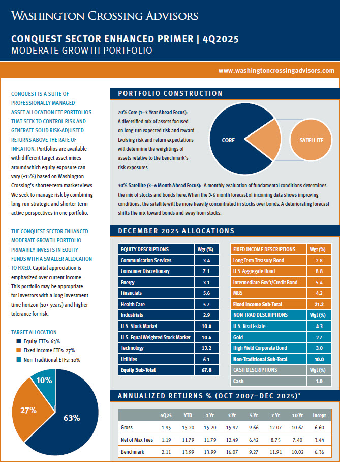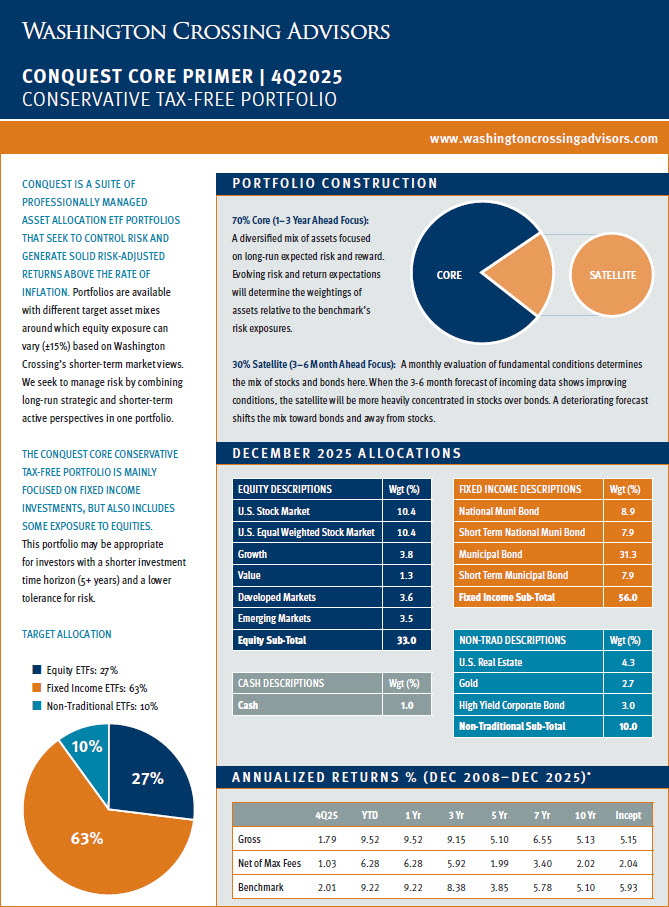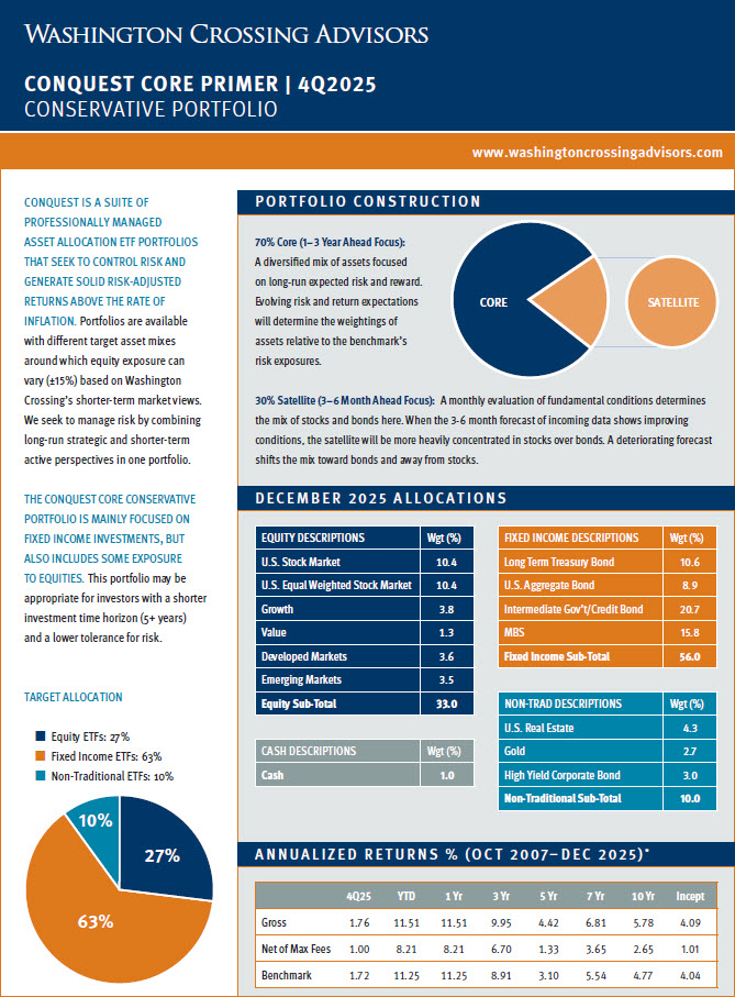 Below is a repository of Washington Crossing Advisors Conquest Tactical ETF Portfolio “Primer” Pages. These one-page documents include a brief description of Conquest and each strategy sleeve along with a quarterly update for individual portfolio performance and allocations. Please click on each strategy page to open the full document. For additional detail regarding Conquest, please see the factsheet, portfolio presentations and other supporting materials on our website, https://washingtoncrossingadvisors.com/conquest.html/.