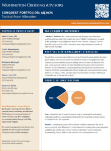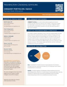 CONQUEST is a suite of professionally managed asset allocation portfolios that seek to control risk and generate solid risk-adjusted returns above the rate of inflation. Continuously managed by the Washington Crossing Advisors team for over a decade, CONQUEST active asset allocation portfolios offer a seasoned, top-down, active alternative to traditional “buy-and-hold” asset allocation strategies.