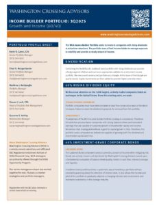 The WCA Income Builder Portfolio seeks to invest in companies with rising dividends at attractive valuations. The portfolio uses a fixed income ladder to seek to manage volatility and provide a steady stream of income.