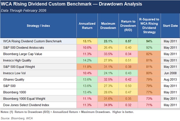 In these cases, defense is a necessity. The WCA Rising Dividend strategy was built with this defense in mind. By focusing on quality companies with growing dividends, we aim to deliver a portfolio that earns competitive returns over a full market cycle while genuinely addressing the downside. The Return-to-Drawdown data in the table above speaks directly to that objective.
