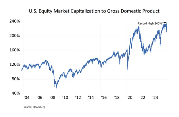 U.S. equity markets have recently set a new record: the total value of publicly traded American stocks now stands at approximately $75 trillion — roughly 240% of GDP (Chart, below). This ratio, often called the Buffett Indicator after Warren Buffett’s description of it as “probably the best single measure of where valuations stand at any given moment,” is at the highest level in recorded history. For context, the ratio peaked near 140% before the dot-com crash and sat around 105% before the 2008 financial crisis. It should also be noted that this figure accounts for only the value of public equity value and ignores the value of private equity.